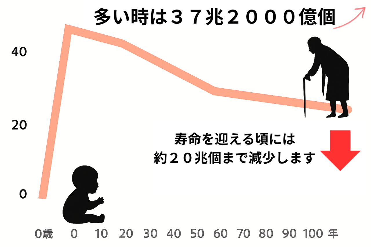 細胞そのものが減れば、当然その中にある膨大な数のミトコンドリアも同時に失われてしまうのです…。