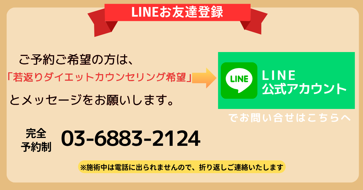 『若返りダイエットカウンセリング』のみのご予約も可能ですので、この機会にご自身の体質や代謝の状態をチェックしてみませんか?
