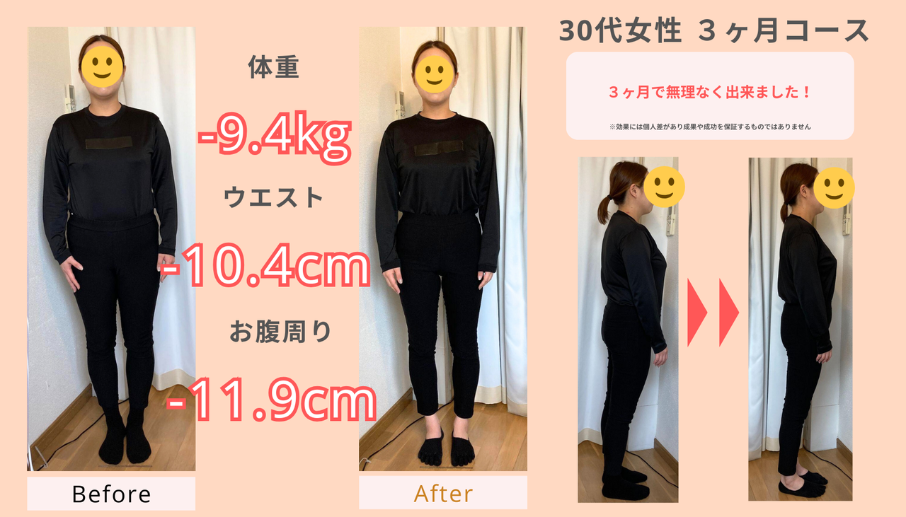 個人差はありますが、多くの方はまず3ヶ月で7~10kgほど体重が落ち始め、その後トータルで12~14kgの減量に至るケースが一般的です。